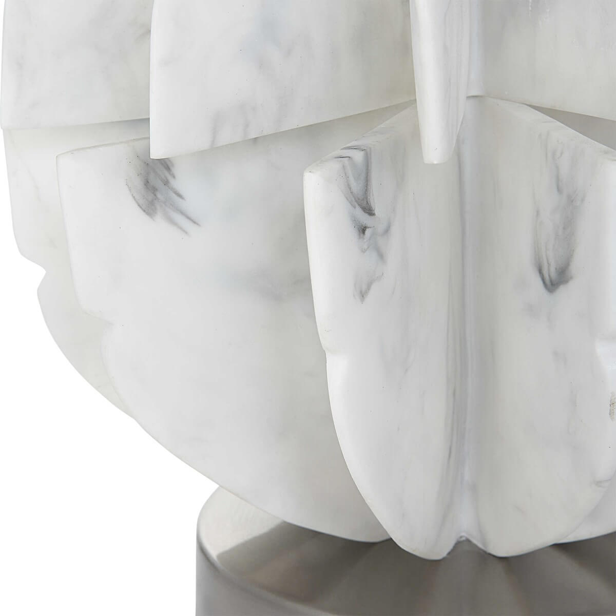 This contemporary table lamp features thin stacked blades that create an organic sphere finished in a white marble look accented by plated brushed nickel accents. The lamp is paired with a white fabric drum shade.