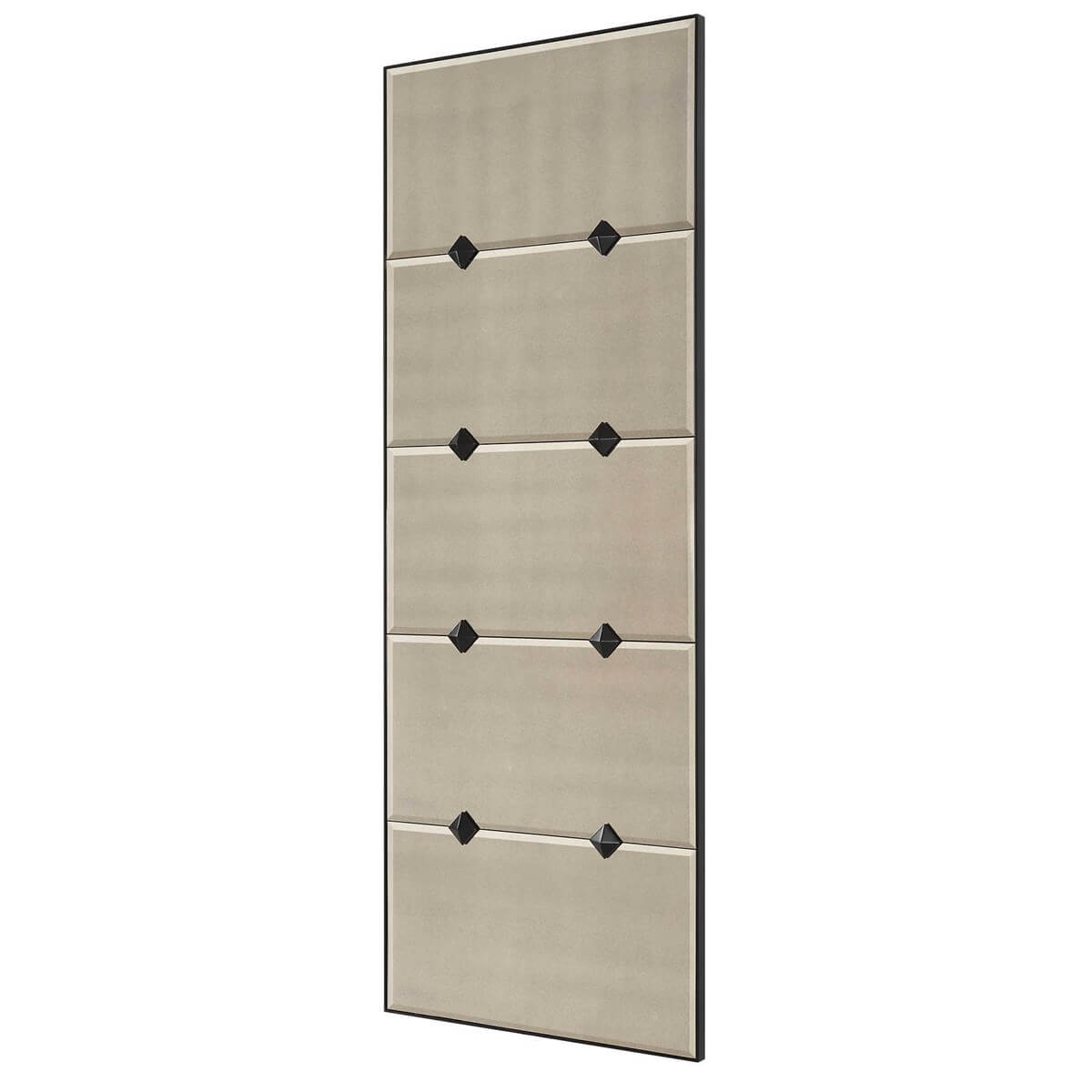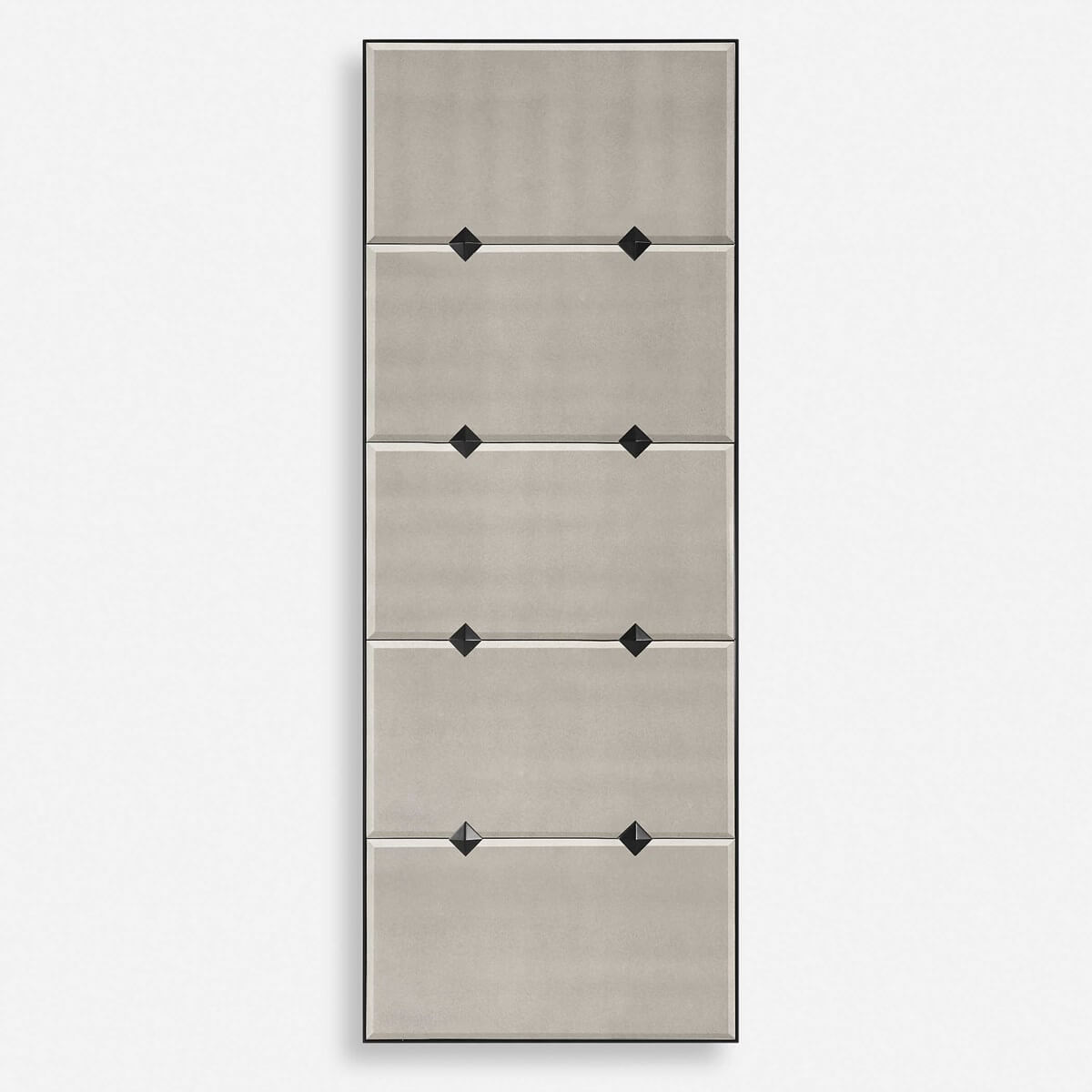 This oversized mirror features antique style mirrors with a petite bevel for an updated traditional appeal surrounded by a slim black iron frame accented with matching metal studded medallions. May be hung horizontal or vertical.
