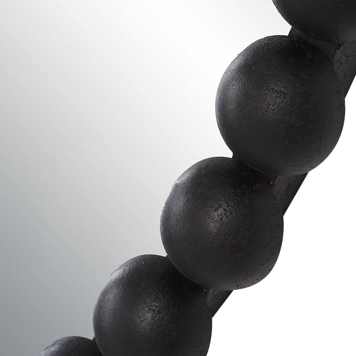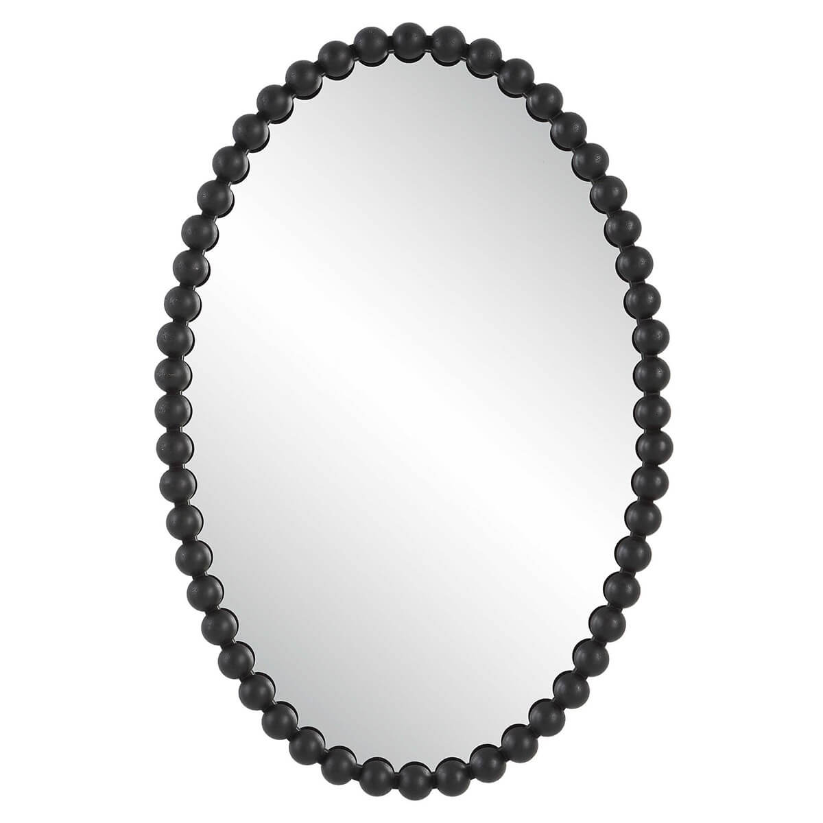 Oval mirror features an elegant curved iron frame with a beaded profile finished in a stylish matte black.