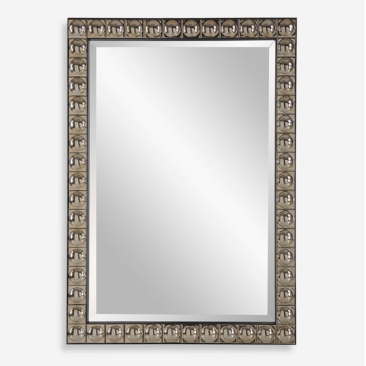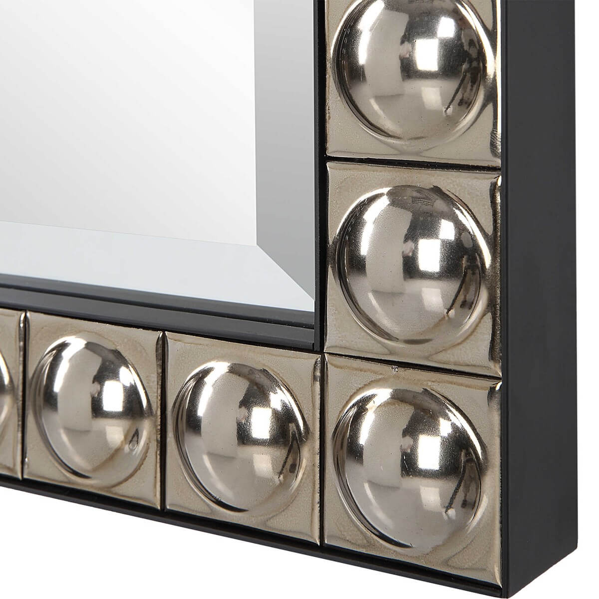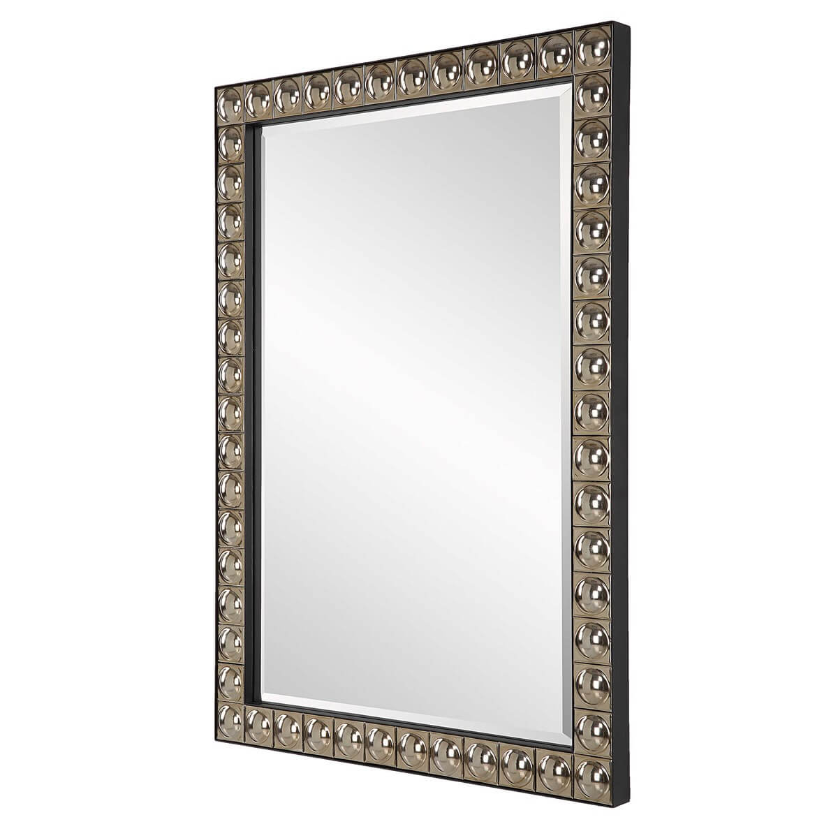 This unique vanity mirror features repeated ceramic tiles with convexed centers finished in an antiqued silver-champagne plating, encased in a black iron inner and outer frame. Mirror has a generous 1 1/4" bevel.