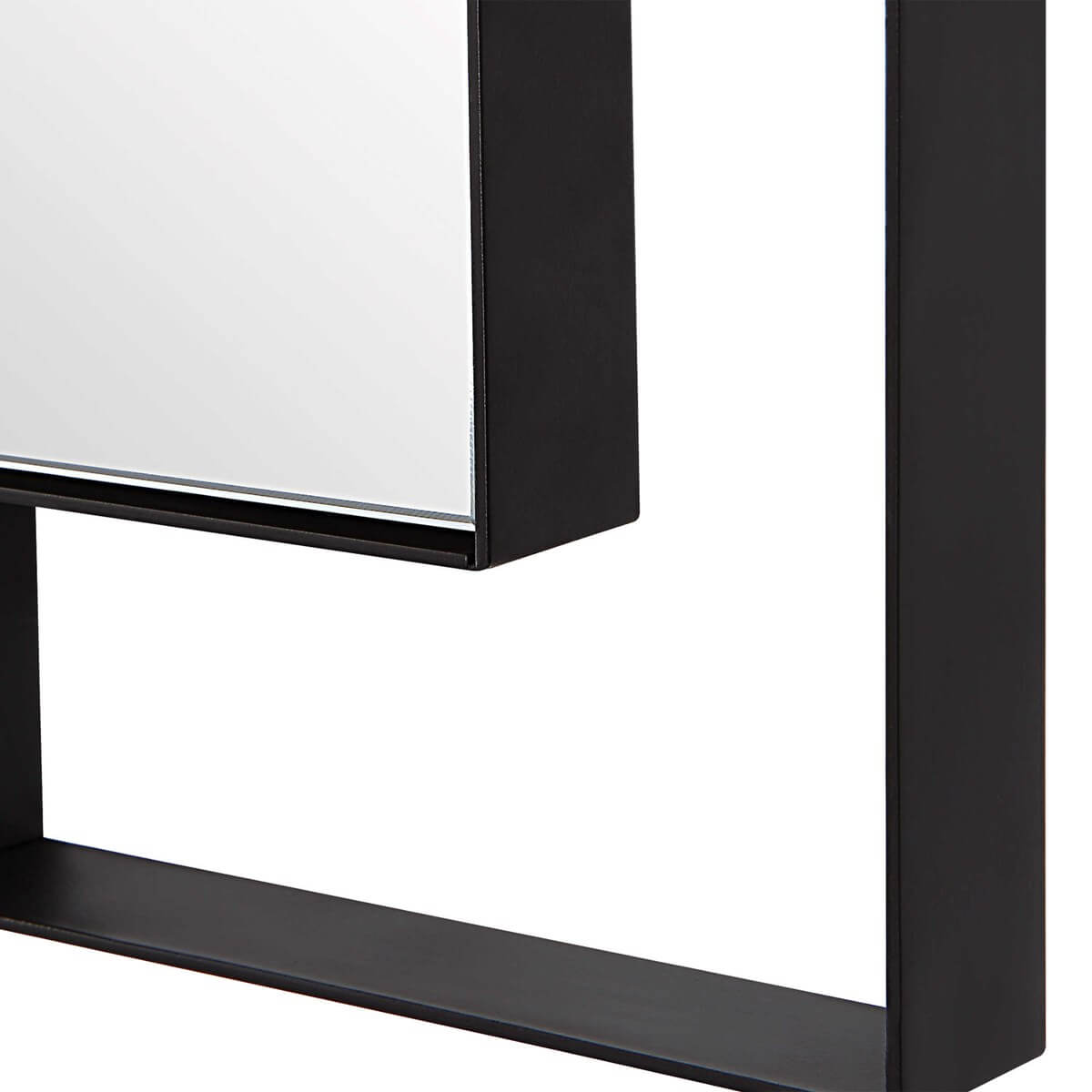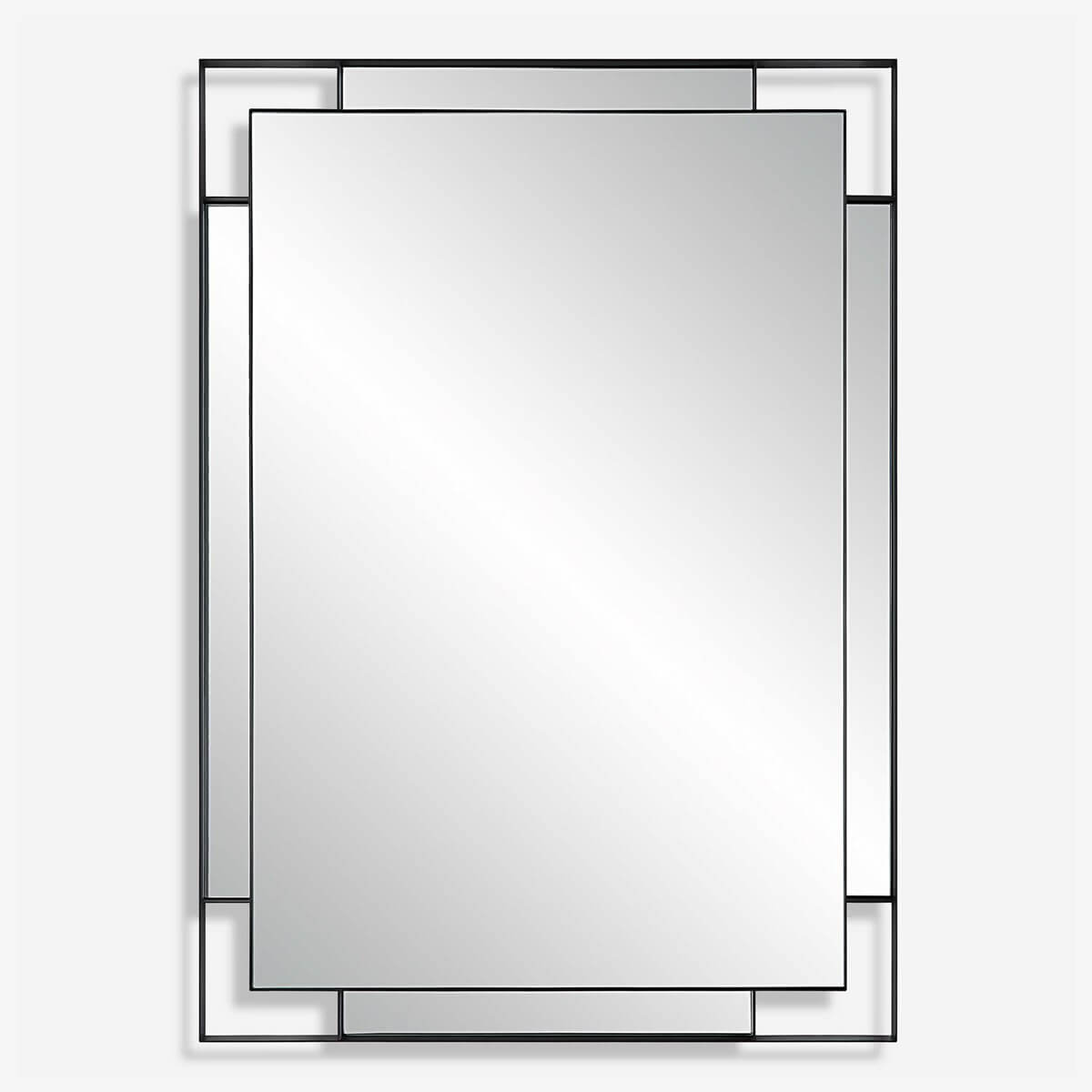 The Stellan mirror features a strap style frame finished in a sleek matte black surrounding a floating polished edge mirror with accompanying side mirrors for added visual dimension. May be hung vertical and horizontal.