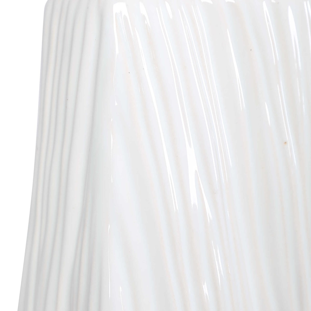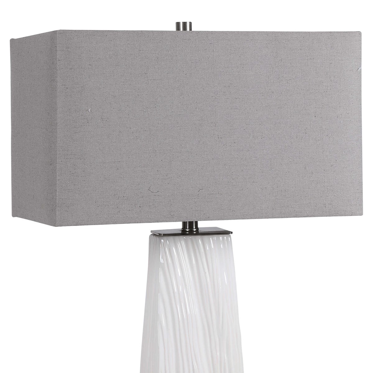 Elegant And Versatile, This Table Lamp Features A Gloss White Ceramic Base Featuring Organic Hand Carved Details And Brushed Nickel Accents. The Piece Is Paired With A Rectangle Hardback Shade In Gray Linen Fabric With Natural Slubbing.