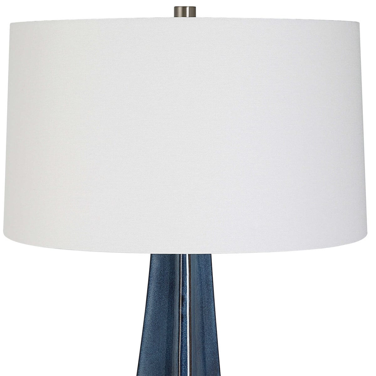This tapered ceramic base features softly scalloped sides finished in a lightly distressed blue ombre with subtle warm brown undertones on the edges, accented with plated brushed nickel details. The slightly tapered drum shade is covered in a crisp white linen fabric. Due to the nature of fired glazes on ceramic lamps, finishes will vary slightly.