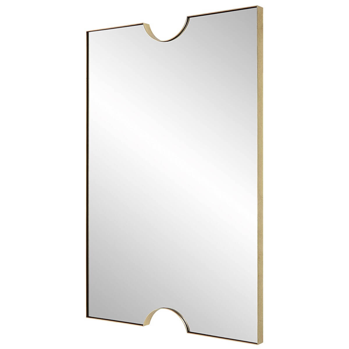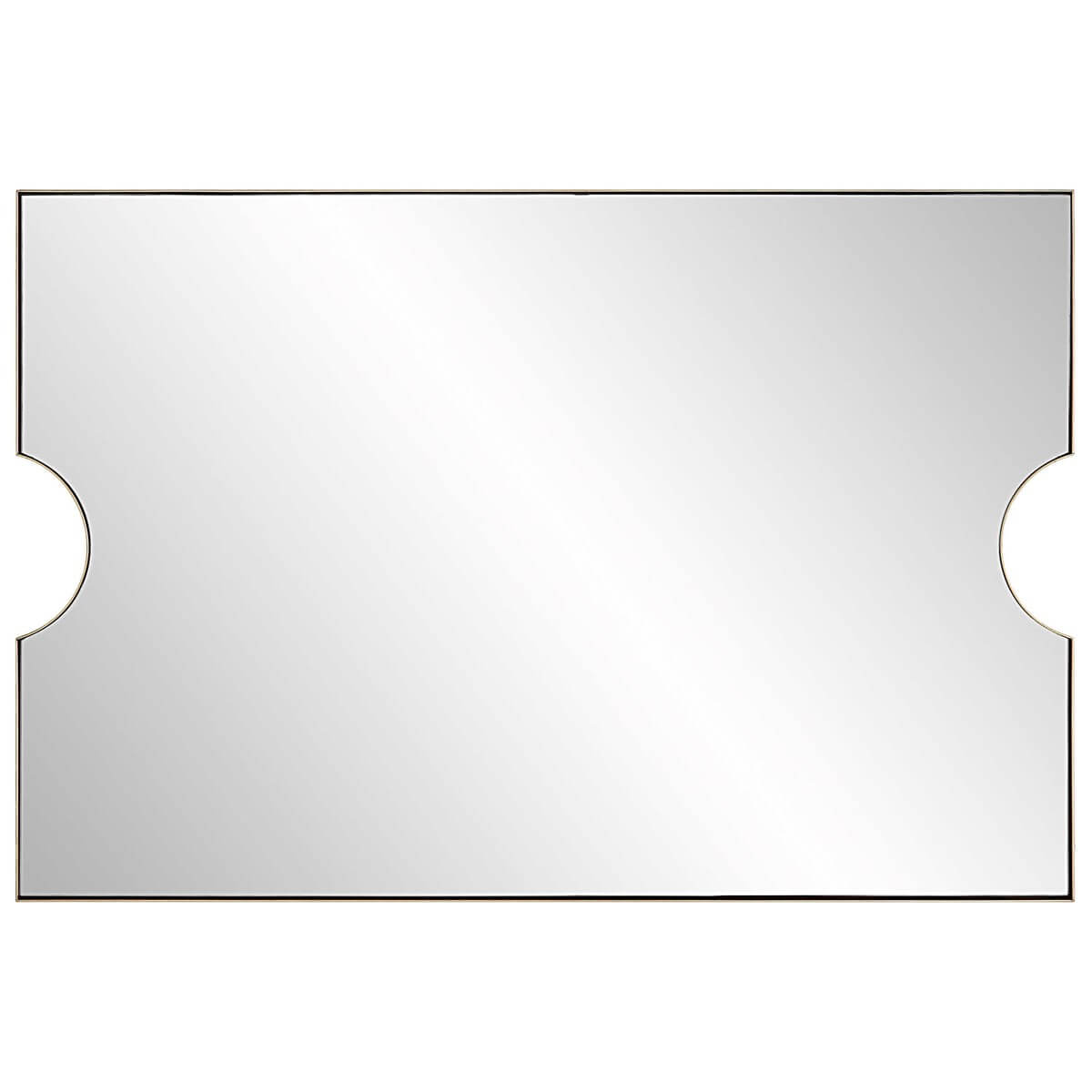 The Ticket Vanity Mirror features a metallic gold leaf finish on an iron frame that surrounds a floating polished edge mirror. May be hung horizontal or vertical.