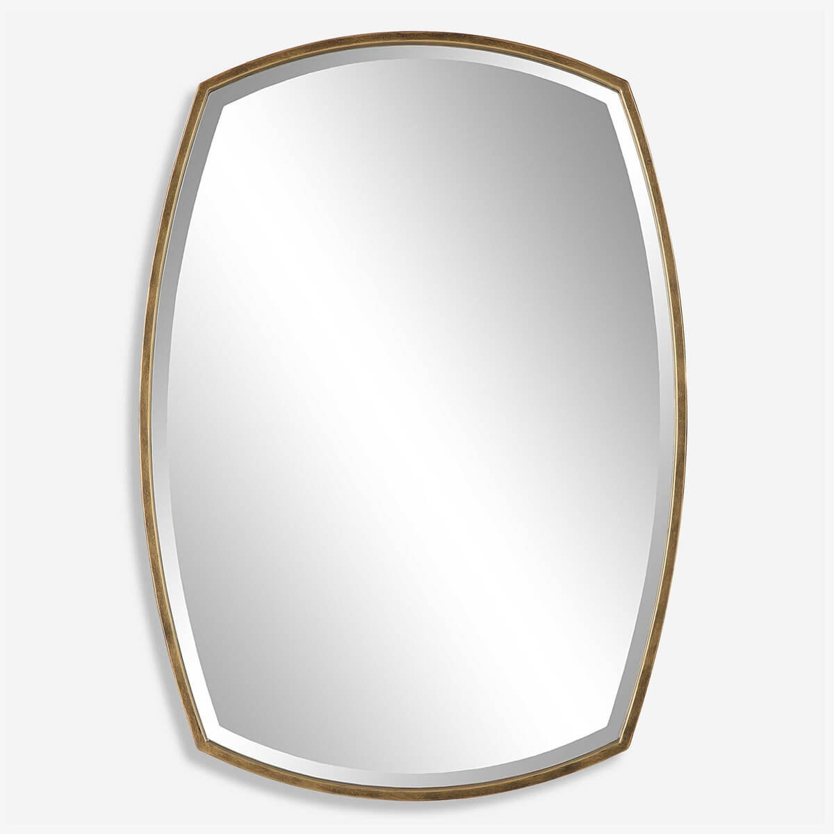 This shapely mirror features an iron frame finished in a heavily antiqued gold with outer curves for an updated appeal to the traditional rectangle. Mirror has a 1" bevel. May be hung horizontal or vertical.