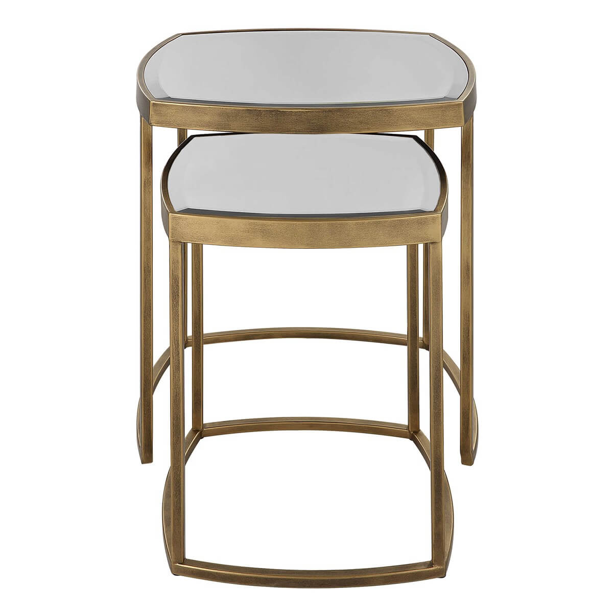 Gently curved lines of the Vista nesting tables are the perfect functional statement, with a boldly framed top inset with beveled mirror finished in antique gold. Sizes: S-15"x15"x20", L-20"x20"x24"