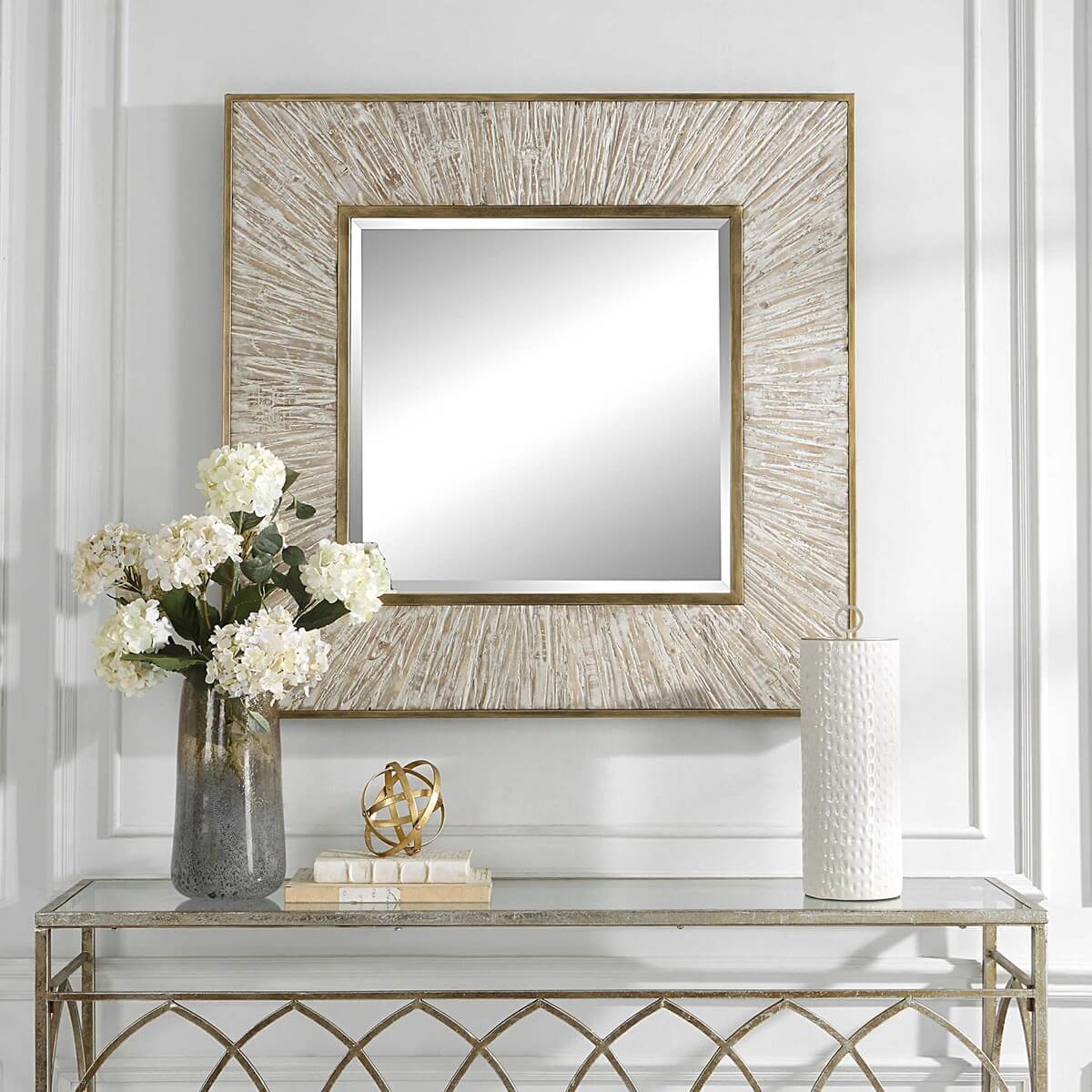 Rustic with a twist, this square mirror is constructed from solid wood in a heavily distressed finish with aged whitewash. Iron details are finished in aged gold. The mirror features a generous 1 1/4" bevel.