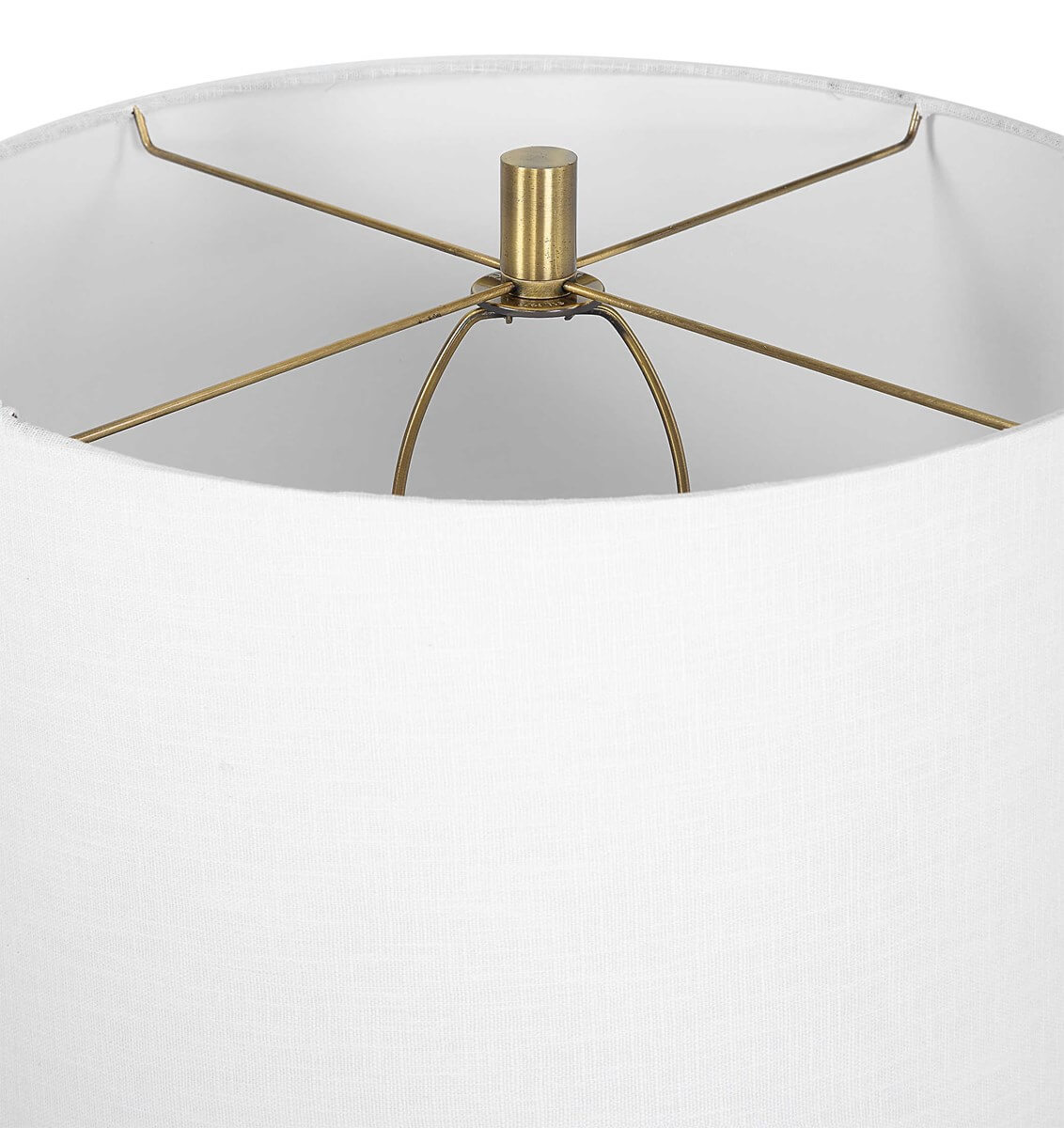 This ceramic table lamp features a geometric patterned design that's finished in a lightly distressed blue glaze, accented with plated antique brass details. The tapered drum shade is a white linen fabric with natural slubbing. Due to the nature of fired glazes on ceramic lamps, finishes will vary slightly.