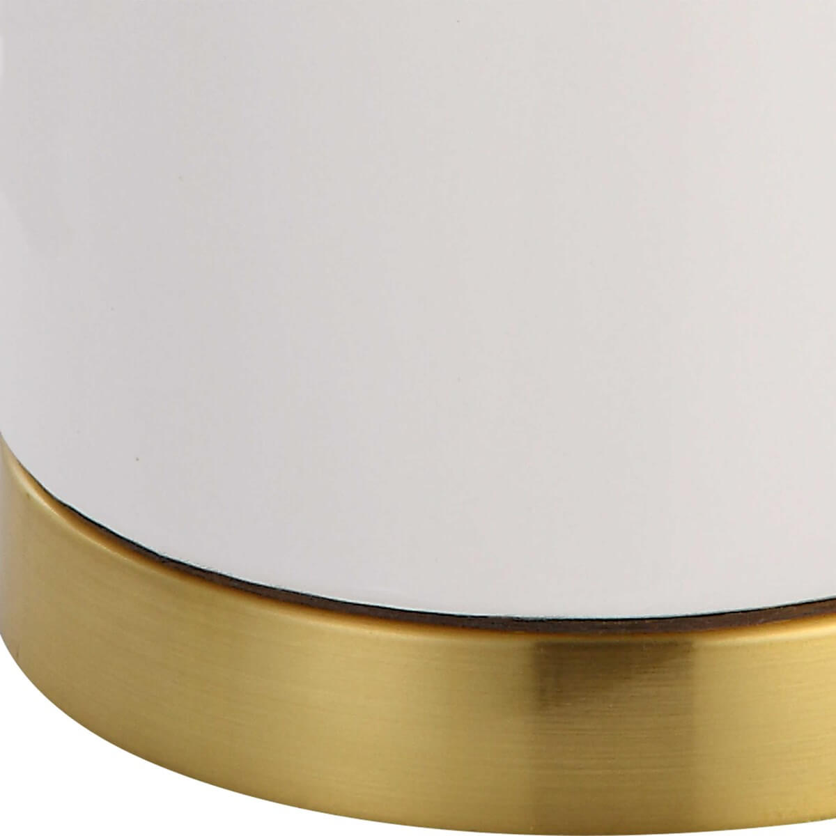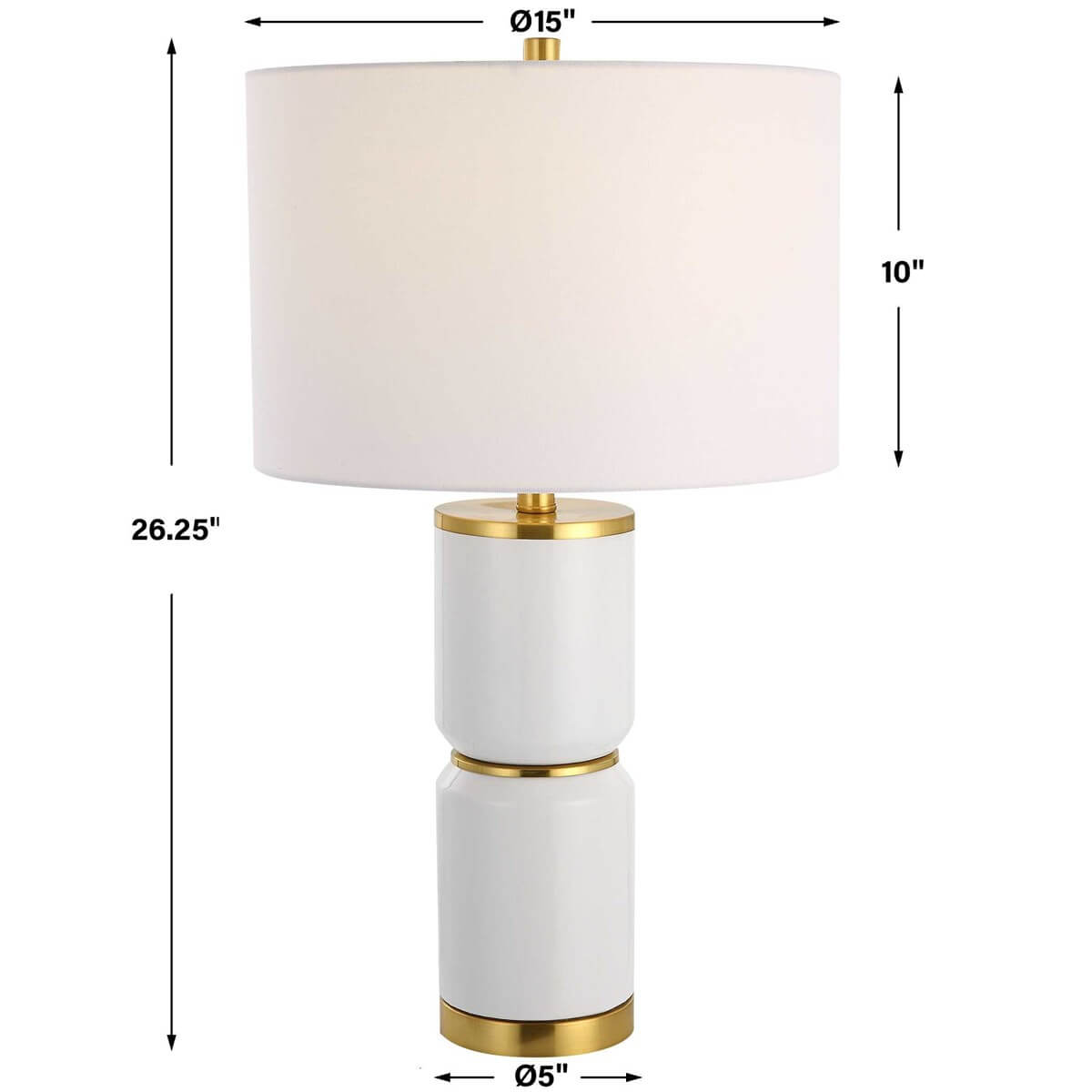 This beautiful gloss white ceramic table lamp, accented with a vibrant gold, sits atop a metal base. A thin metal band softens the wide cylinder body. A round hardback white linen shade completes the look and makes this a perfect lamp for a nightstand or on an end table in a family room.