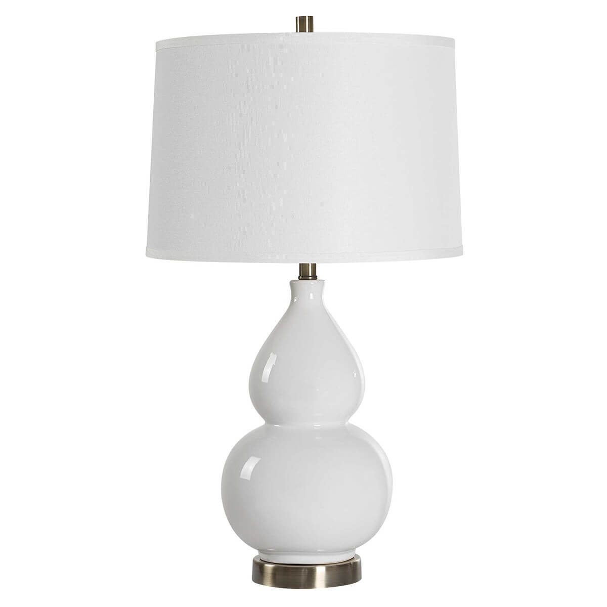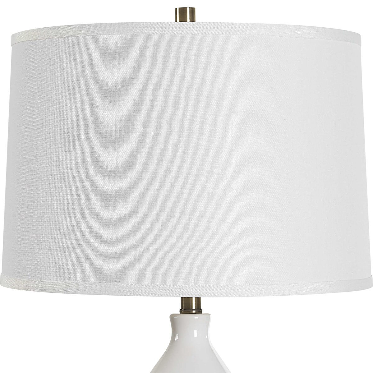 This beautifully crafted table lamp features a pristine white ceramic base in a graceful gourd shape. The antique brass accents add a touch of vintage charm, perfectly complementing the classic design. A slightly tapered shade in white linen fabric with .5" trim on top and bottom completes the timeless look.